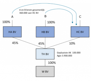 Werknemer W is in dienstbetrekking bij W B.V. De aandelen in W BV worden gehouden door A en B, beide via hun eigen holding. De waarde van de aandelen wordt in overleg met de belastingdienst geschat op € 4.000.000. Werknemer W kan 10% van de aandelen verwerven. Er wordt een nieuwe tussenholding opgericht waarbij de aandelen (via Agio) worden gestort. Vervolgens wordt 10% van de aandelen in de tussenholding (TH) verkocht aan de werknemer W (aan zijn eigen holding HC BV) voor € 400.000. 10% wordt betaald uit eigen middelen van W en 90% wordt gefinancierd A en B (hun holdings). De lening wordt verstrekt voor een periode van 5 jaar tegen een rente van 2% met als zekerheid een pandrecht op aandelen TH B.V. De lening wordt niet kwijtgescholden als er in de toekomst een restschuld overblijft (bijvoorbeeld bij verkoop). Dividenden uit TH worden gebruikt voor het betalen van rente en aflossing. Een inspecteur zou op grond van uitspraken van de rechtbank kunnen stellen dat sprake is van een beloningsinstrument (Rechtbank Den Haag dd 27 februari 2024 ECLI:NL:RBDHA:2024:2616 of Rechtbank Den Haag d.d. 3 november 2025 ECLI:NL:RBDHA:2025:12842), mede omdat er een hefboom ontstaat (rente 2% en 90% financiering), de lening lijkt namelijk onzakelijk.