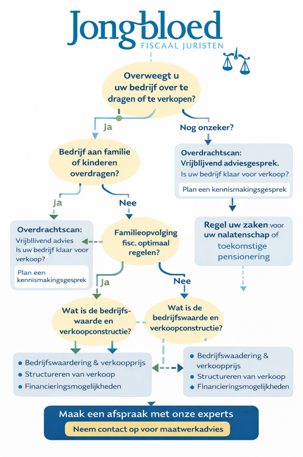 Wij adviseren wekelijks MKB bedrijven bij een opvolging, overdracht aan kinderen en/of verkoop. Een gedegen voorbereiding (voorkeur 3 - 5 jaar voor de opvolging of verkoop) is hierbij van belang. De belangrijkste fiscale adviezen zien op: